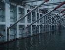 二、采用一排滑动支撑杆支撑活动坝面的背面(注:工程照片上采用的是H形活动双杆支撑,以后工程都采用滑动单杆支撑更牢固),构成稳定的支撑墩坝。